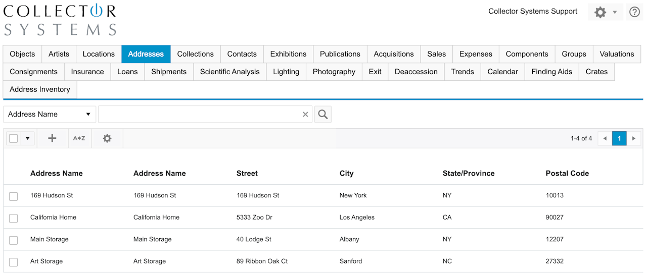 Collector Systems allows users to associate Object records with a specific address. These are saved in the Addresses tab.