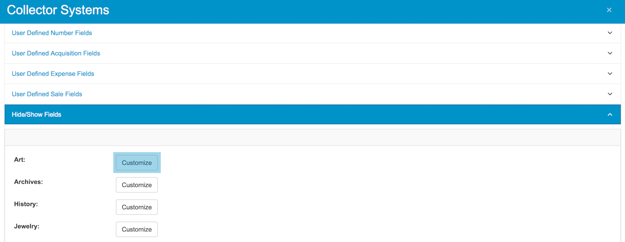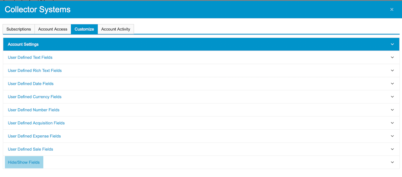 In the Account Settings window, click on the Customize tab. In the Customize tab, select Hide/Show Fields.