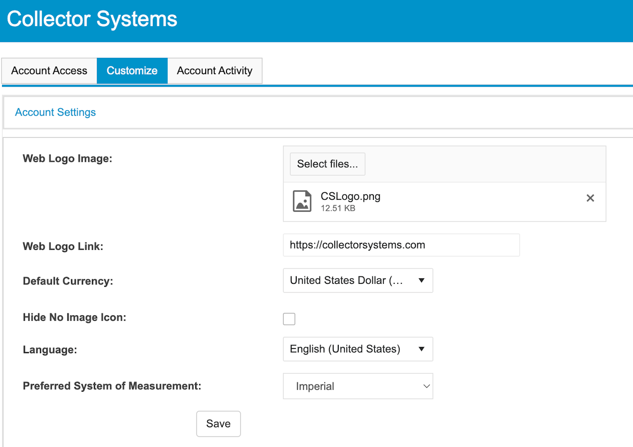 Collector Systems provides users the ability to replace the default CS logo in the top left of the screen with their own.