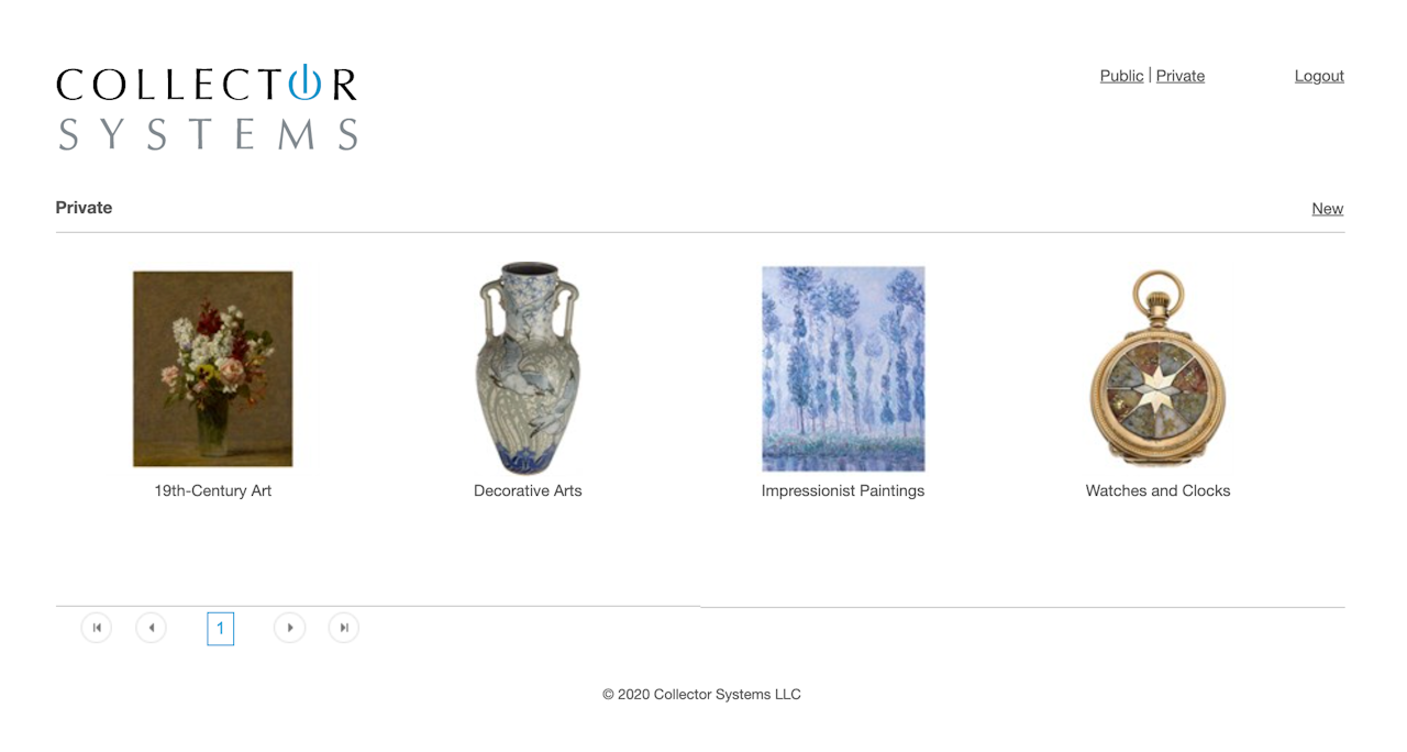 The Gallery allows you to share Objects from your Collector Systems account in virtual view-only "showrooms" that you control. You can choose which Objects are shared, what information and images are included, and who has access to each group of Objects in the Gallery.
